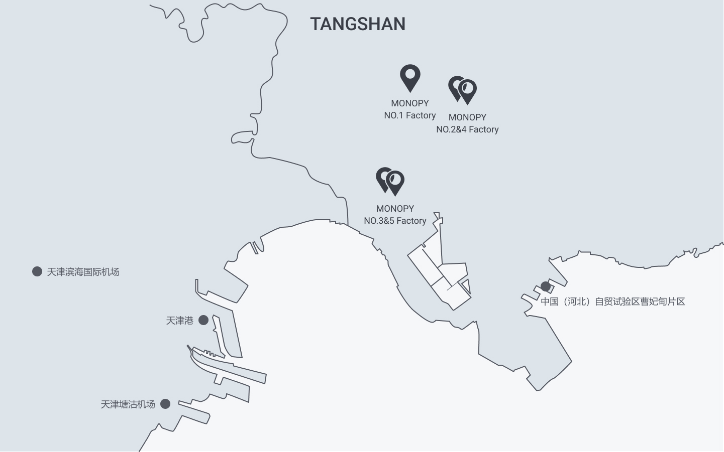 The five major production facilities of Monopy are all located in Tangshan city, which along