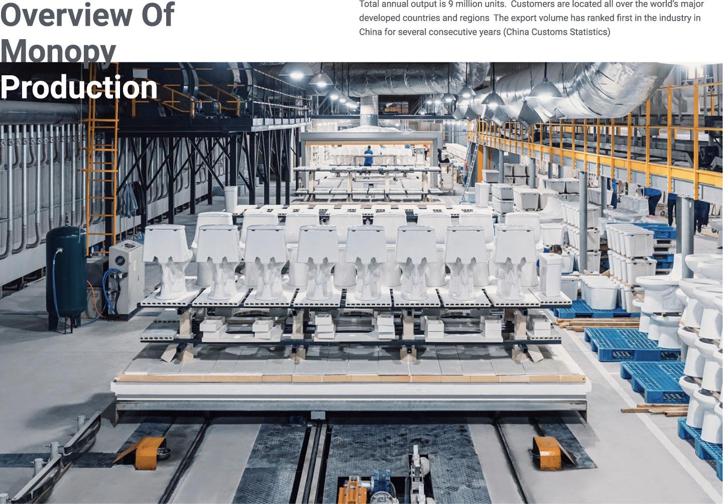 Monopy has 9 tunnel kilns and shuttle kilns, more than 500 advanced production lines with an annual output of 9 million sanitary products. Standardized and large-scale mass production mode guarantees the quality of each product.